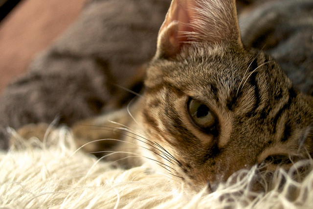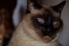 Pretty kitty. Focus is just right on the eyes, and it looks like you were pretty wide open since the nose is a bit blurry. It seems a bit under exposed, though. Still a nice picture to start off with.