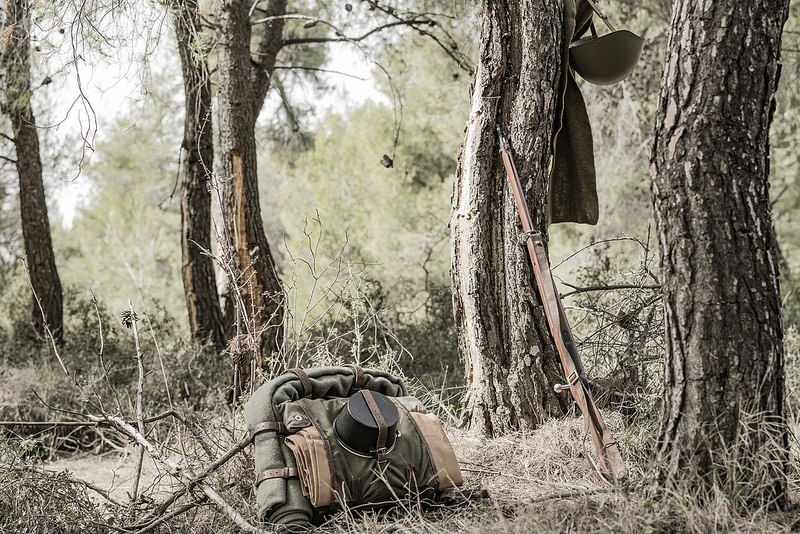NEEDFX: I really like the slightly muted tones to give the impression of age and the way you've used a shallow depth of field to bring focus onto the pack, rifle and adjacent trees. Great use of DoF to generate a picture that tells a clear story by minimising the confusing contribution of a busy forest background. Great job. OK it's only an enactment but makes you ask what happened to the soldier?