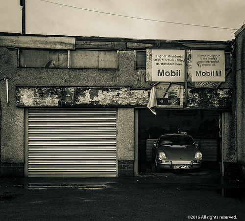 KENOH: the almost disjointed composition and toning on this one are spot-on for the theme and give the effect of a grabbed-shot rather than something staged. Great atmosphere. The choice of Porsche could also be appropriate since the merger into VAG and the decline towards badge-engineering.