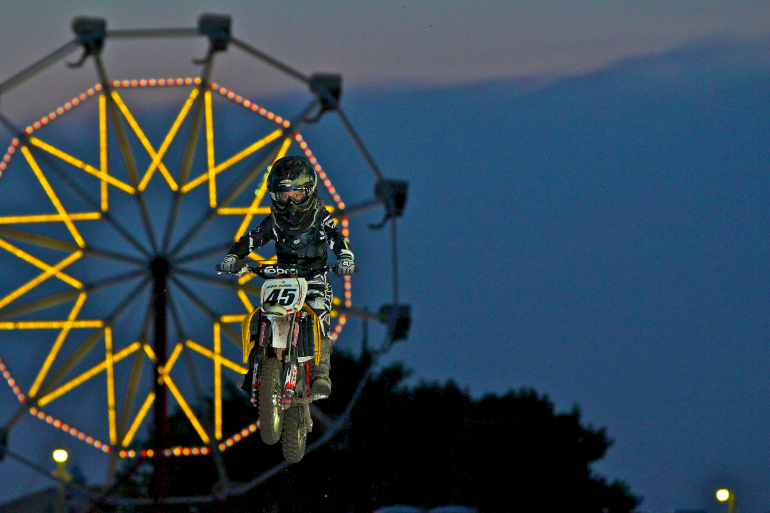 Was a night Motocross picture, featuring remote flash, sunset, and a lit Ferris wheel
