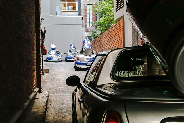 @zaphodtheprez – Ha ha ha, these little Minis are fun aren’t they? RedBull cans on the back and they scoot round town advertising. I have never worked out if they are used for anything more useful such as deliveries loading product in the can or not. This is a funky shot of them but on balance I find it a bit busy and I wish that they were lined up in a more uniform way to get a leading line from them maybe from a ¾ viewpoint.
