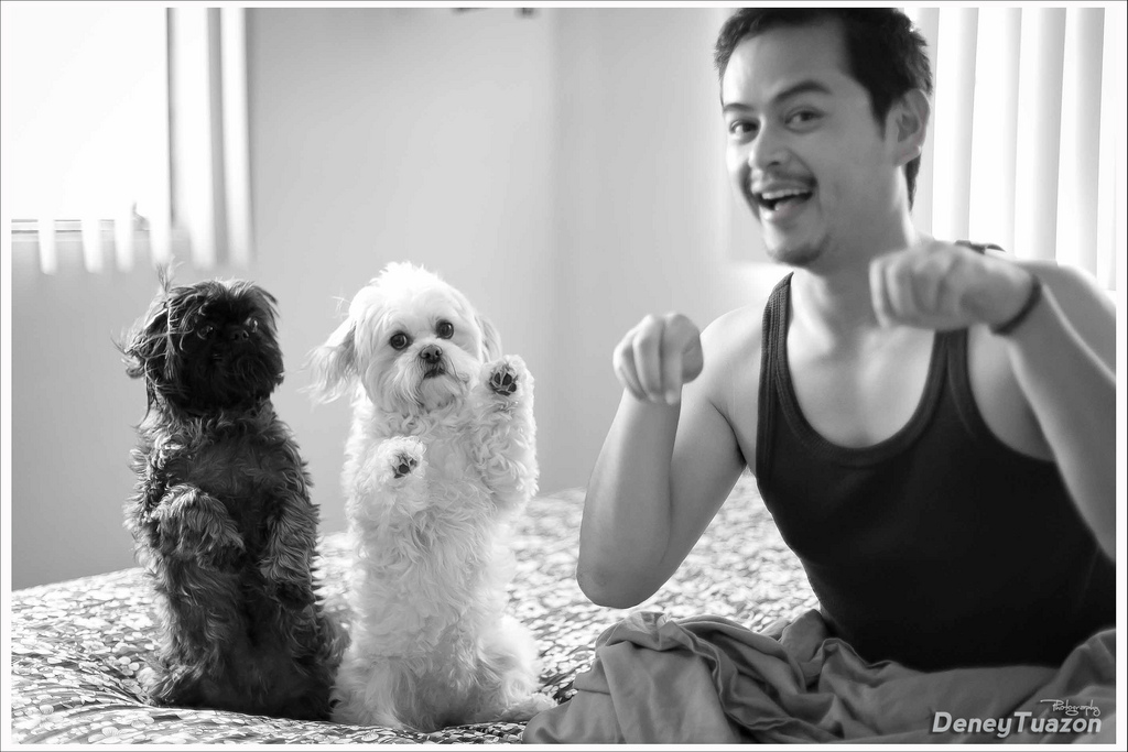 Awesome! The B&W works so well for this picture given the contrast of your subjects, and I love how one dog it looking toward his master and the other is looking into the camera! The story this tells is priceless.