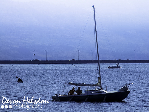 Dhelsdon In my mind, an otherwise beautiful shot suffers a bit from too much going on in the frame. The sailboat still commands my attention, but my eyes are constantly drawn away from it to either the man in the kayak, the boat in the immediate background, or the many cars passing by on the road/bridge. The fog (or haze) does a nice job of fading the background.