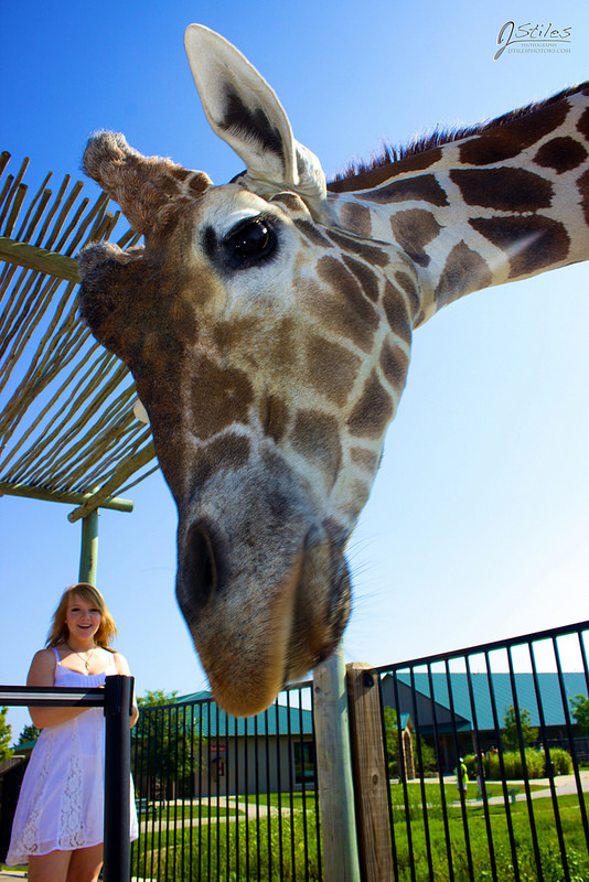 DirtySocks85 This is a wonderful creative use of a wide angle lens. Sometimes wide angle shots of animals produce an accentuated unflattering large and humorous nose. Your photo is not so much distorted. I like the girl in the background and her expression. She is a part of the photo without being a distraction. There is no confusion who is the subject of this photo! Very creative composition and it looks like you used a fill-flash. Otherwise the giraffe, whose face is mostly shaded, would be underexposed. Nicely done DirtySocks.