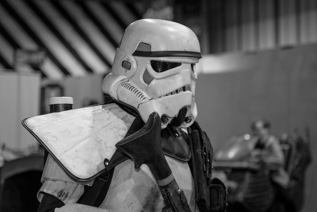 Apple fanboy It looks like you might have had the good fortune to attend a festival of characters. Anyone that would wear that helmet and suit around all day definitely is a character. Your photo is nicely exposed and has a nice gritty mood. If it were me, I would cropped it a bit tighter. And, even though nicely blurred, I find the guy in the lower right still a distraction.