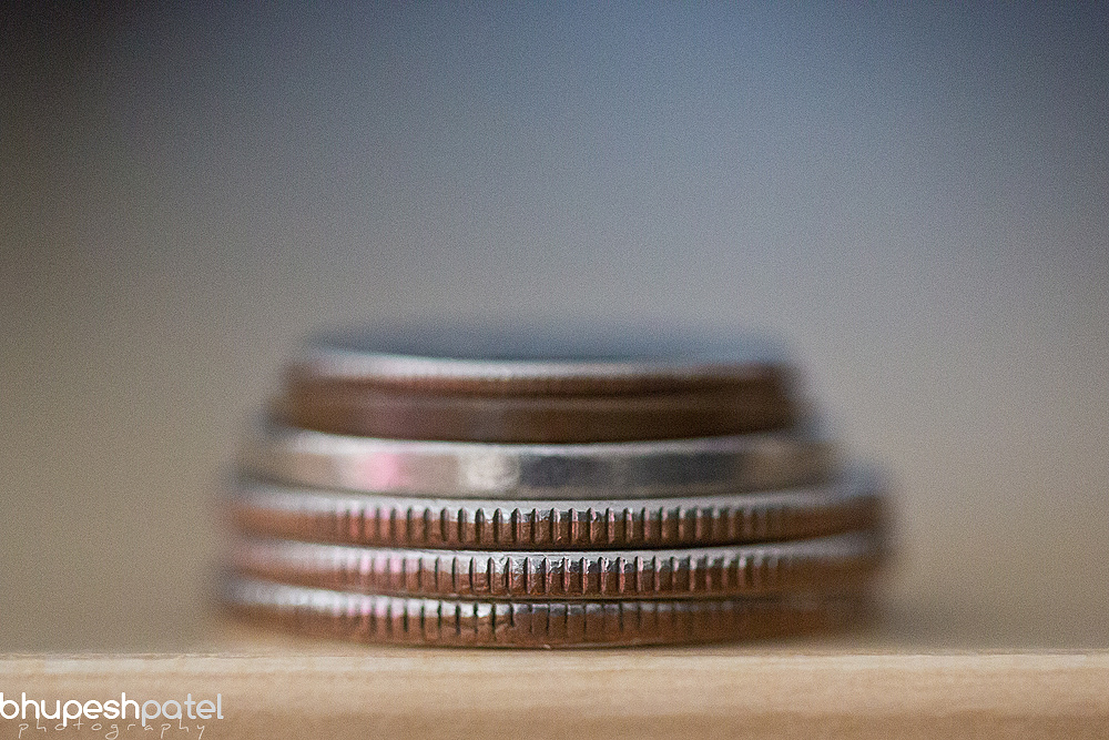 I like the way the coins blur out a the edges . Depth of field or done in post ? Nice nondescript background , just fades away .Would you have been able to achieve the same effect if the top 16 cents were in focus?