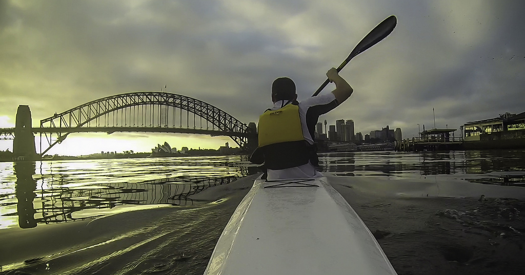 fitshaced : The kayaker soon to be dwarfed by the bridge . Nice reflection off the water . Taken from another kayak with a long lens? But wait…. There’s more !!!