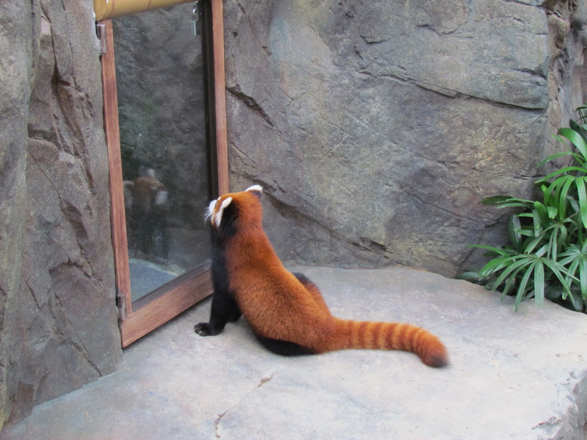 The red panda is waiting for the keeper, probably for food. You would think it was admiring itself in the reflection, but porpoises are the only animal with enough intelligence to realize they are looking at themselves.