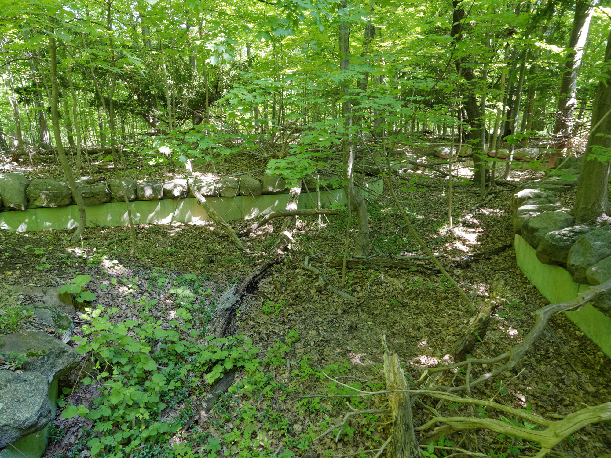 The pool is/was once part of one of the estates that graced the top of the Palisades along the Hudson . They're all gone , and the structures mostly razed , save one ,starting in the 1920's and going into the '50's , to make way for a highway project and attached parkland .Walking around the parkland , you find lots of residue from the estates like this pool , foundations , what's left or gardens and drives , stairs going to/from nowhere . I'm not real sure which of the estates this particular pool belonged to , but it might have been this one ...