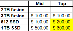 1TB Fusion > 512GB $300 on the two entry level models, 2TB Fusion > 512GB $200; and on the two entry model 1TB Fusion > 2TB Fusion $200 so theres $100 difference in the upgrade depending on storage config