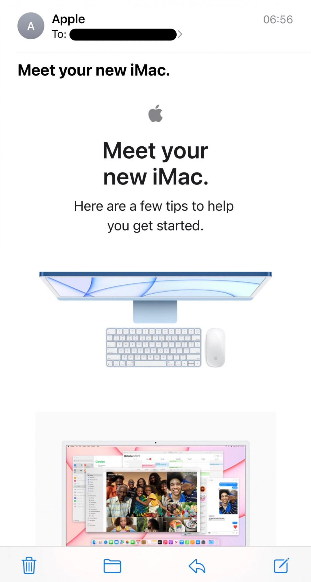 I just searched my email and apparently this is the forth “Meet your new iMac” email I’ve received. I get so much junk mail that I guess I overlooked it. Apple has sent me one every three months. Maybe my iMac has been phoning home to Apple saying it’s being neglected and ignored 😂😂😂