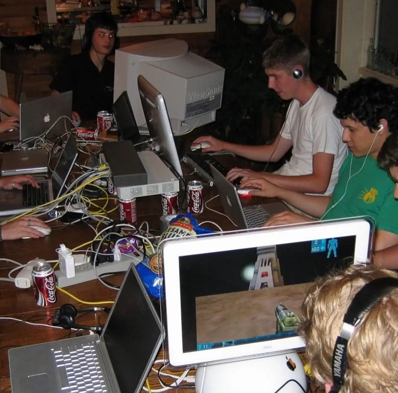 I was looking from old archive photos of LAN parties and came across this picture. Any idea what model of Apple computer it is and timeframe it’s from? The laptops look like PowerBook G4’s but I could be wrong. Also, Even one better if you can name the game, too. Thanks!