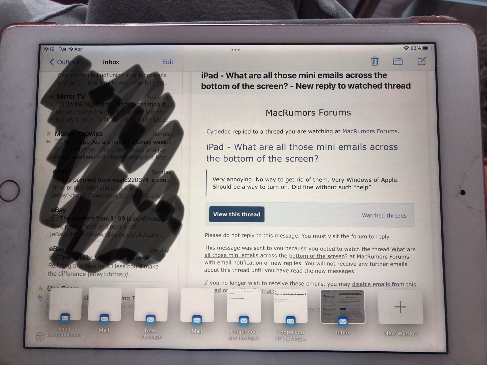 In Mail on my iPad for no reason at all I often find a row of postage stamp sized "emails" across the bottom of the screen. They serve no purpose for me other than be a distraction.