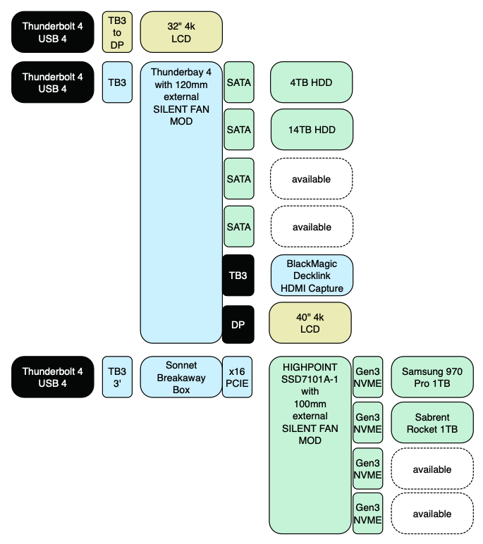 I'd be interested in your fan mods. I have the Thunderbay 4, which is the only thing I hear with my Studio setup.Coming from a MacPro 5,1 and a high end hackintosh, I had a pre-existing NVME interface and SSDs as well as HDDs to accomodate for the mac studio with external enclosures. Since external enclosures generally introduce noise to the environment, I was able to mitigate 90% of the the Thunderbay's fan noise and 100% of the SSD7101A's fan noise with the creative use of larger, lower RPM fans. I can follow up with pics of the modifications of there is interest.