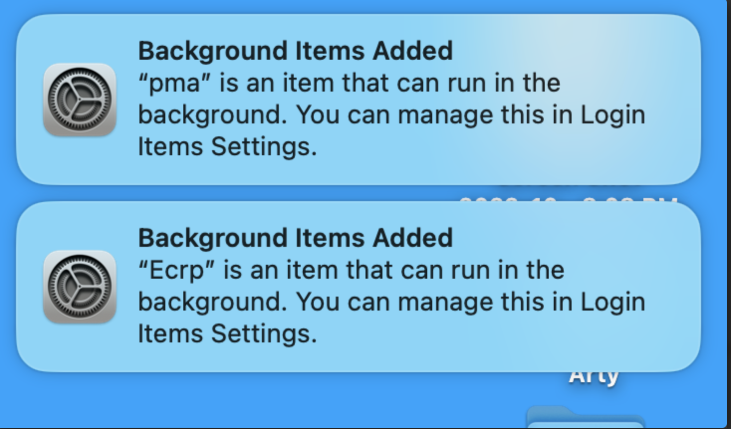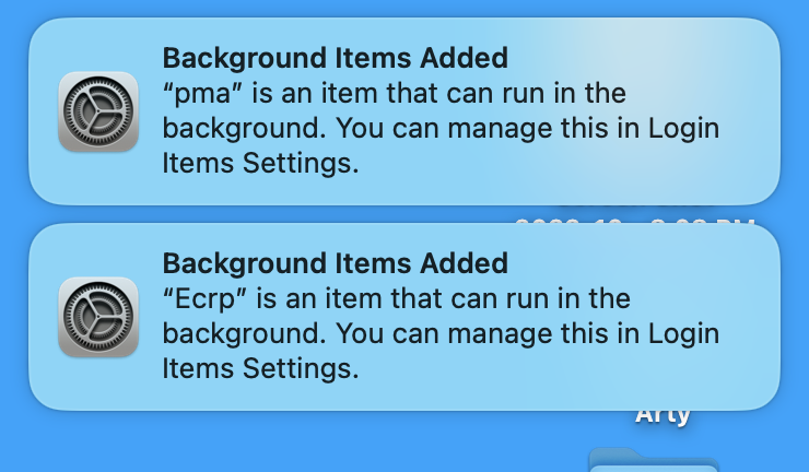 The Notifications appeared on my desktop when Ventura 13.1 finished installing. I don't have Chrome installed. Okay, thanks for your help.They would be installed by one or more of the applications you have on your computer. They didn’t come with Ventura, they're just being pointed out to you that they will run in the background in service to some application, and only you can know what that is. I believe that pma is a Windows file. If you have Chrome installed it might have come from that. I have 2 3rd party apps that can run in the background which are shown in Settings/General/Log in items. You likely have several there that use those items you’re asking about. You can also disable them in that setting but you could find out very quickly why they were there when one of those applications pops up a notification for you, or it wasn't necessary to begin with.