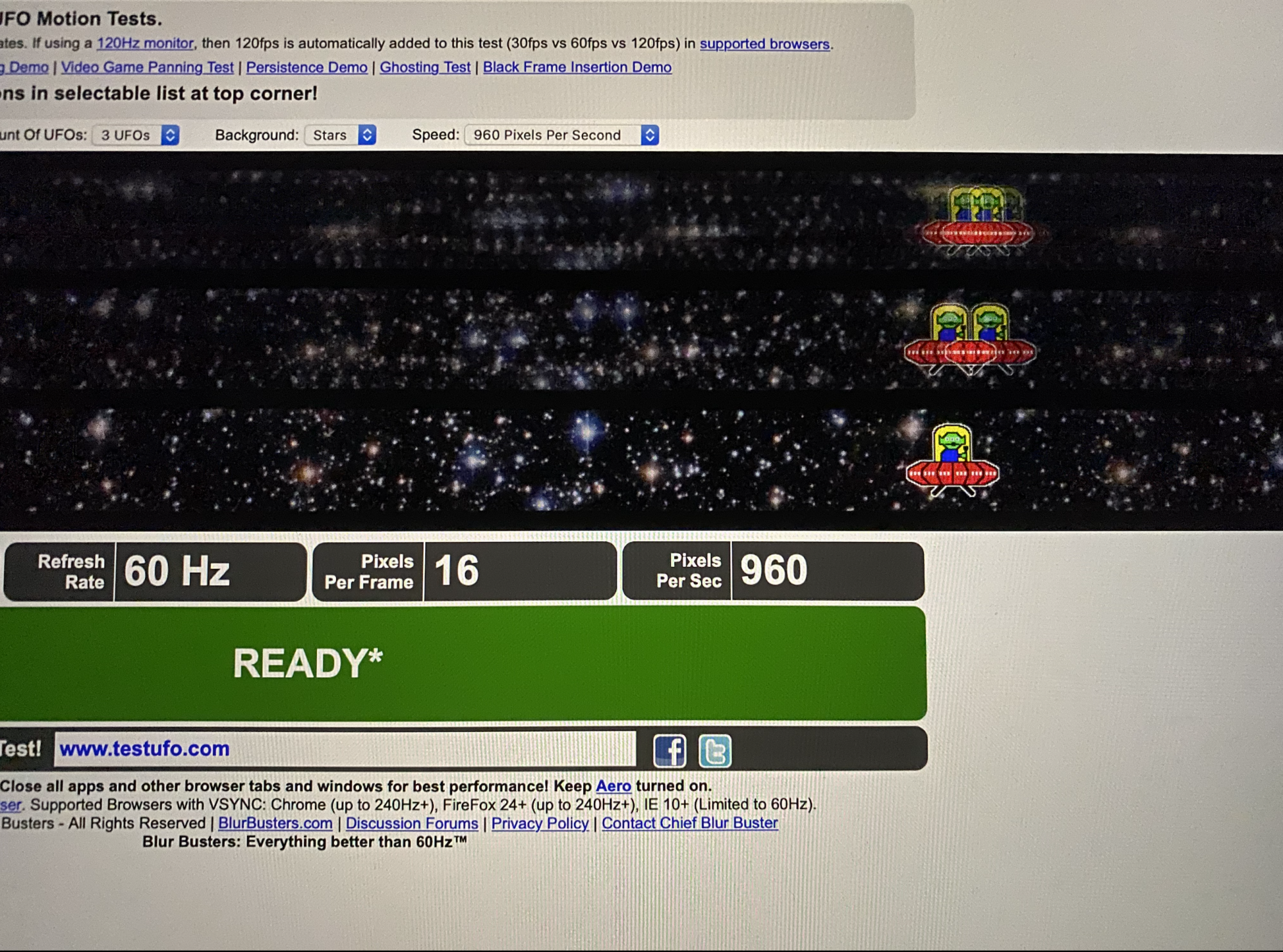 15 FPS (not 60), so of course it's going to show a much better result. At 30 FPS you see a very clear shadow image, and at 60 you see what people might describe as the smearing effect with many UFO shadows and a blurry, indistinct background. In other words, the screen response time would need to be