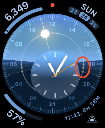 “This watch face (available on Apple Watch Series 4 and later) features a 24-hour, circular dial that tracks the sun as well as an analog or digital dial that moves opposite to the sun’s path.”
