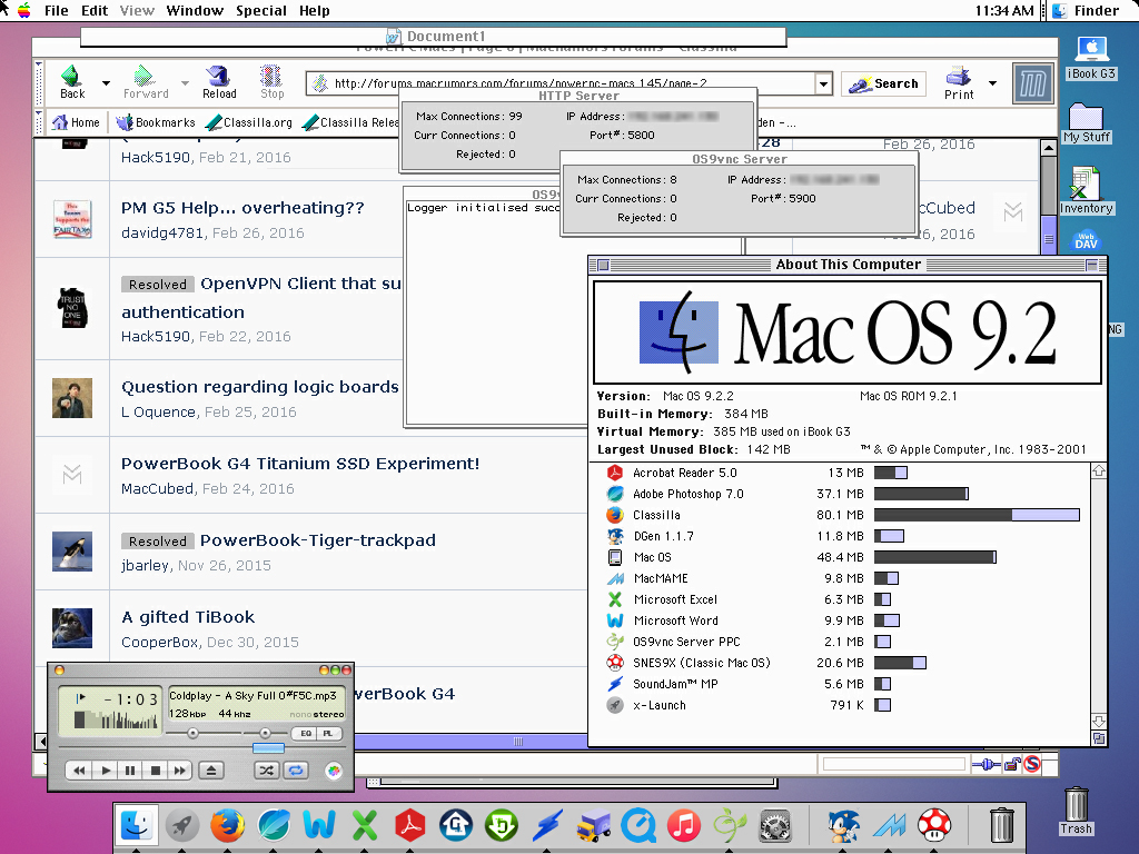 Found and old screenshot of my iBook G3 running OS9.2.2 . I remeber getting Webdav working. I was surprised it works so good on OS9. It is now currently running 10.3.9 . Primary usage is for for iTunes.