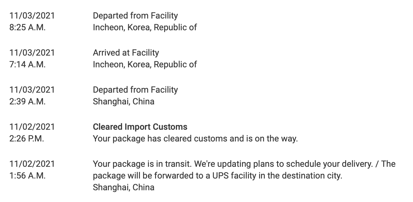 We're updating plans to schedule your delivery. The package will be forwarded to a UPS facility in the destination city.