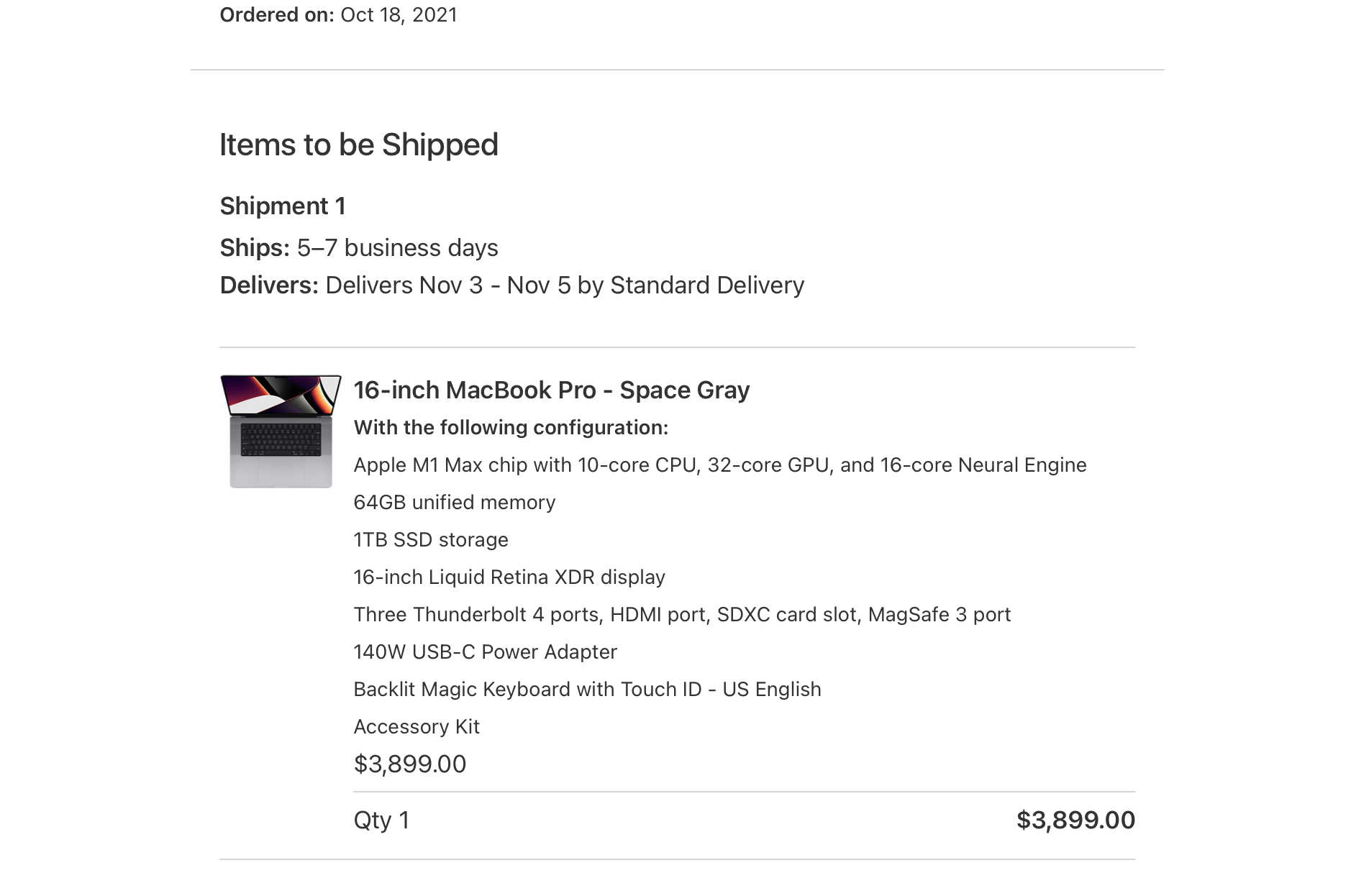 Yes. 16 inch, M1 Max, 24 core GPU, 32 GB memory, 1TB SSD. Delivery to mid-Canada Dec. 2-10. It would be a month earlier if not for the 24 core which bumped things from the Pro (I was actually looking at) to the Max, which therefore 'demanded'/included the 16GB bump to 32GB RAM.Anyone else gone for a 24 core GPU? I wonder if that's what's affecting my delivery date.