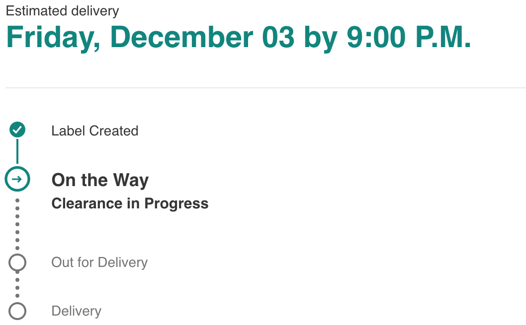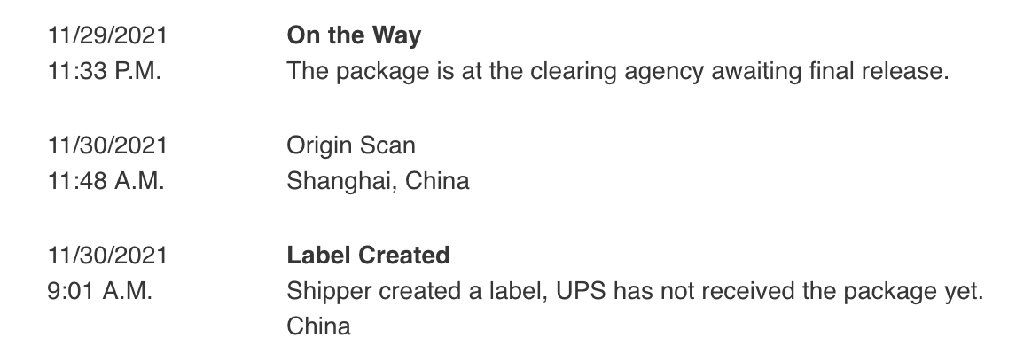 ~2:00AM Nov 25, received shipping notice email with link to UPS tracking. As expected, UPS tracking was not available