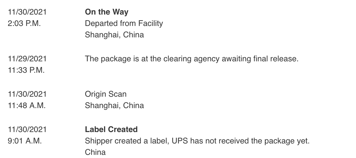 Now, more than 100 hrs since receiving shipping notice email, UPS tracking still says