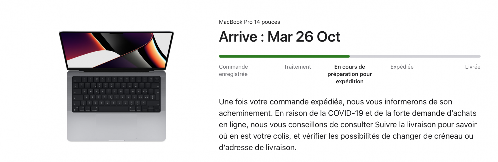 Don't put too much stock in the "status" on the apple page. Mine still says "Preparing to ship" on the apple site, but I already got the tracking through UPS (shared above) and know my machine is now sitting one state over in Louisville, KY.Mine still says October 26th to Nov 3rd and it hasn’t even been charged or prepared for shipping 🙈