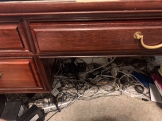I have a bunch of external hard drives (+ NAS drives); Mac mini, eGPU, dongles with wires plugged in, USB speaker, two monitors (plan on making this three), game consoles (PS3, PS4, Switch), lamps, landline phone, ethernet wires, microphone, etc.