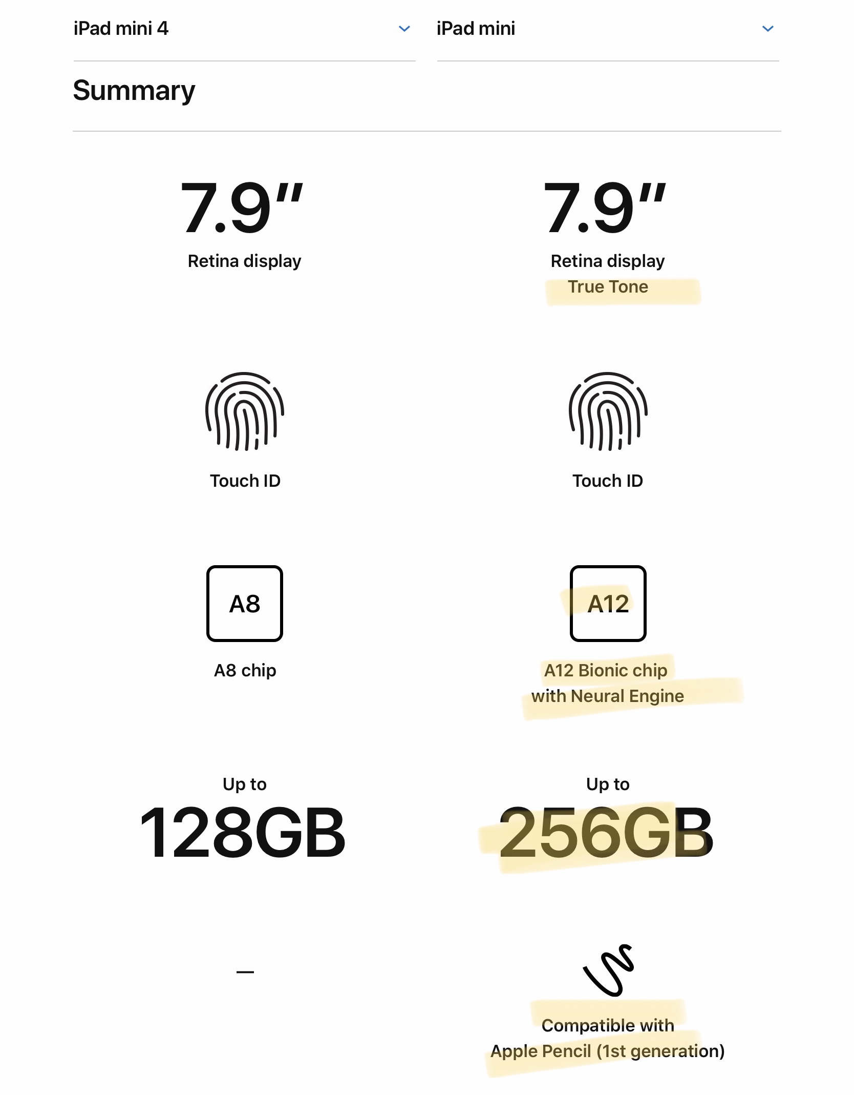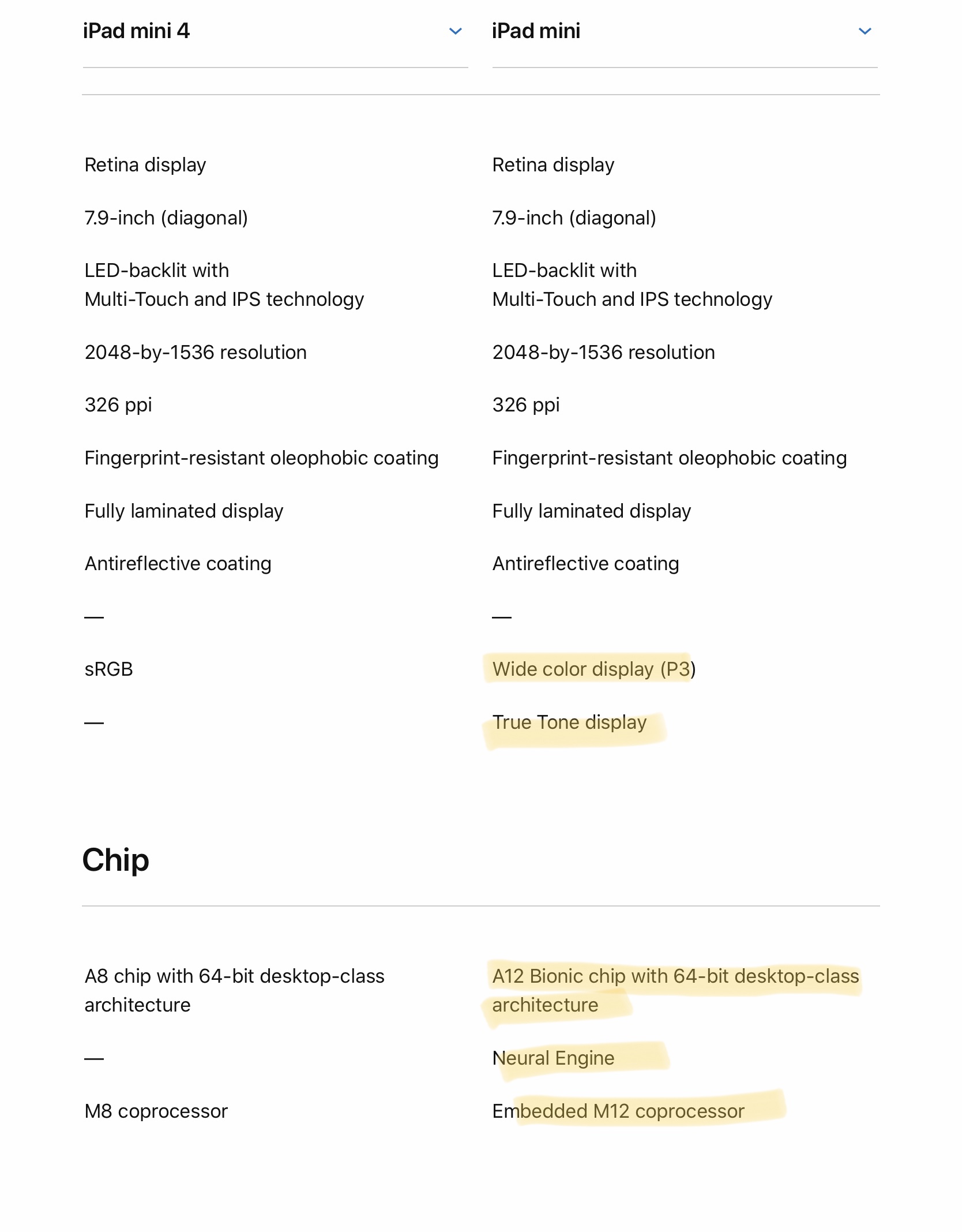 titrau said: My kid has last version mini 4 and i plan to get her new one on this b/d does resolution better .? does display better ? if everything a same only A12 chip then skip it thaks Click to expand... I was bored, so, “You’re welcome.” Seriously, just go to Apple.com and comapre them.