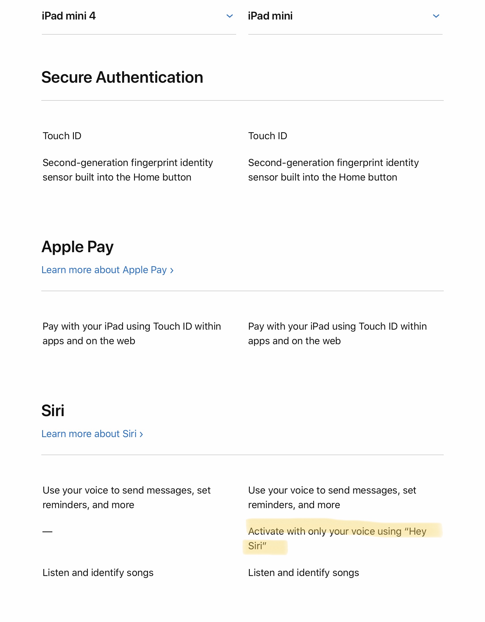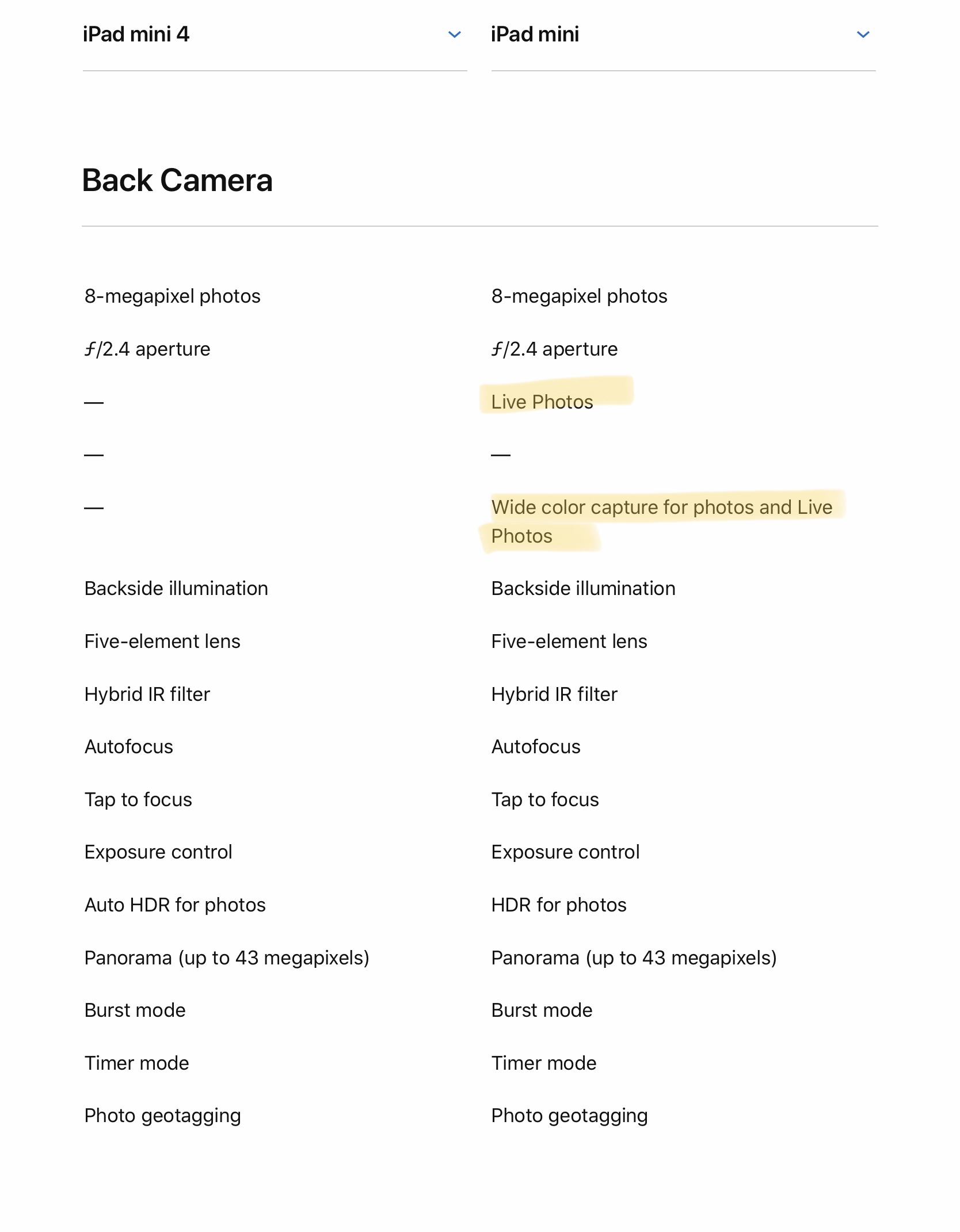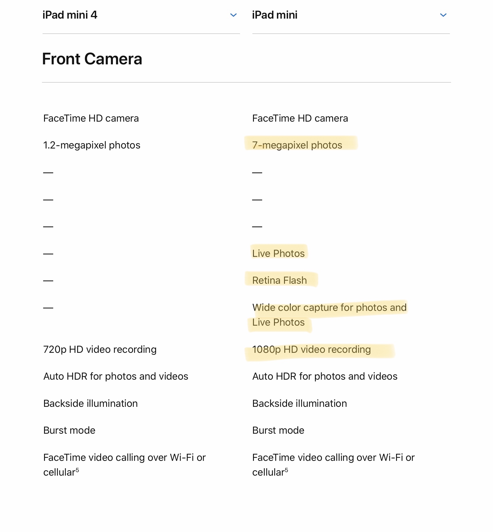 willmtaylor said: I was bored, so, “You’re welcome.” Seriously, just go to Apple.com and comapre them. View attachment 833057 View attachment 833058 View attachment 833059 View attachment 833060 View attachment 833061 View attachment 833062 Click to expand... It looks as if the iPad Mini 4 has a front facing 12 megapixel camera. Just saying. Edit: I looked closer and it says 1.2 megapixels. The image quality messed me up.