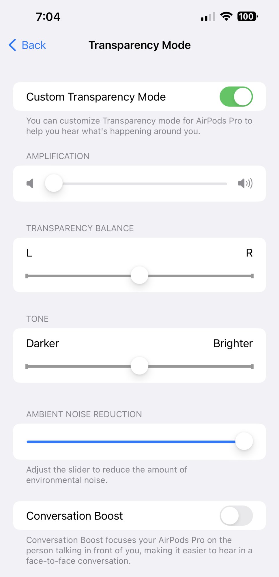 I took screenshots of my settings. I don’t use Transparency Mode very often, but the Headphone Accommodations definitely apply while in that mode. I’m in ANC 99% of the time.