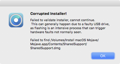 I'm trying to build a Mojave installer with OCLP (1.4.3) and keep getting the below error, which aborts the process. I've tried Mojave installers downloaded from two different places and I have tried with two different flash drives, both of which are fully functioning. I've also tried adding the flash drives to SysPrefs/Spotlight/Privacy to prevent indexing. It's strange because I managed to build a Monterey installer the other day without issue.