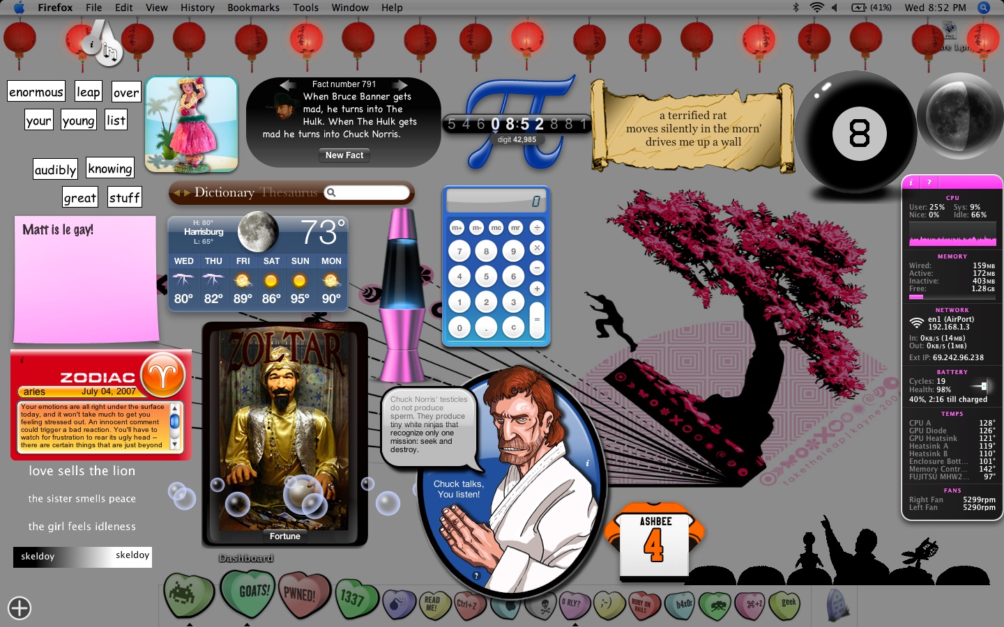 Alot of stuff, I know. I am just so addicted to the little fun widget toys!!! No one should ever be without their Widget Lava Lamp, Haiku generator, Chuck Norris Facts generators, Zoltar, Pi Clock, Hula Girl, Magnetic Poetry, Horoscope, Sticky Notes, Floaty Bubbles, Magic 8 Ball, Flashy Chinese Lanterns, MST3000 cast, Philly Flyers Jersey Calendar, etc. ;p
