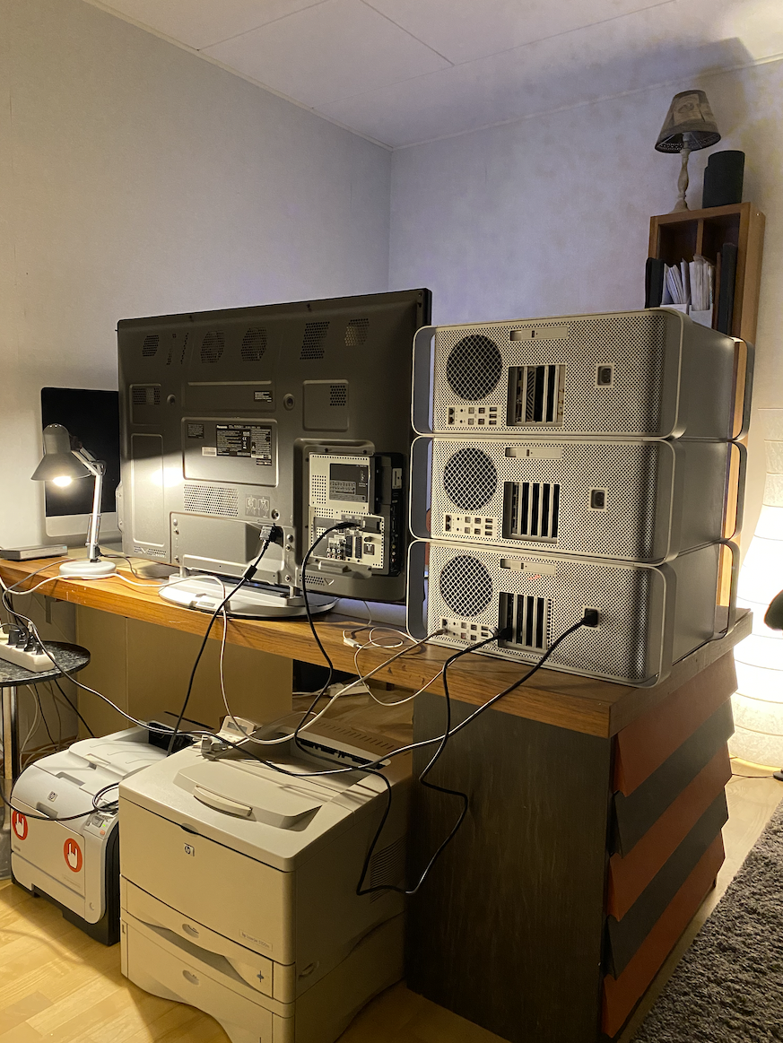 Yooooo I miss seeing people's setups. This was SUCH A FUN THREAD! It's nice to see some new setups every now and again...I love your tri-tower with the old Mac Pros...that's sick!