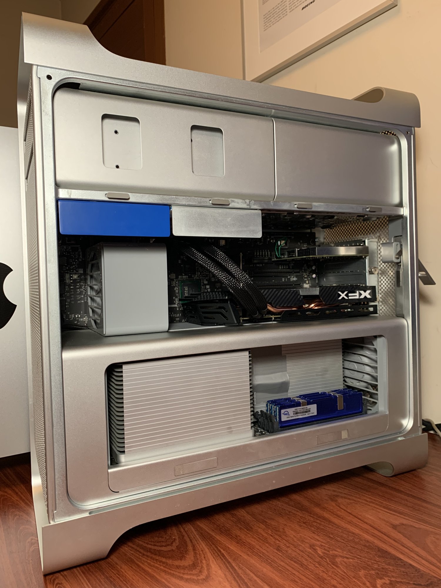 I got that Mac second had from an ad-agency, mainly for its dual CPU tray. Externally it had a few scratches but not broken and it ran. I swapped the dual CPU tray out of it for my good Mac Pro 5,1 (my original one) and put dual X5690s in that. And the pre-owned machine got my original single CPU tray and a X5690.