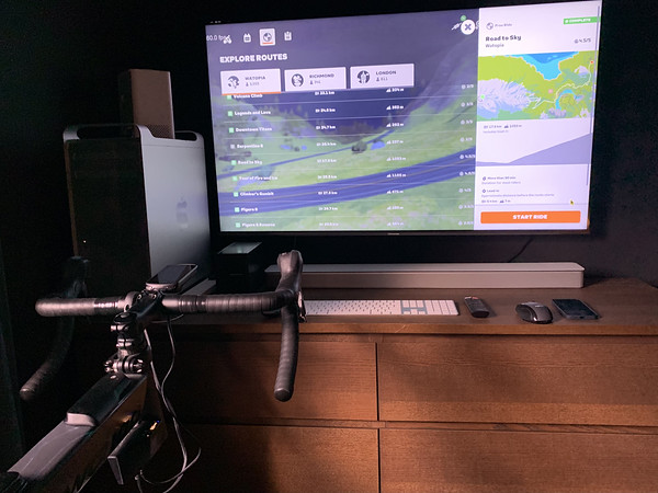 Connected with it is a Wahoo Kickr Bike via ANT+ or Bluetooth and a Hisense 55" 4K TV.