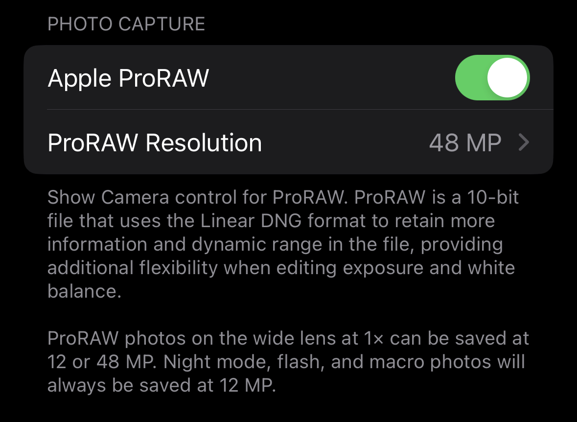 Gix1k said: I have the setting checked. Taking pics outside here at night and each pic is 12MP even when I choose RAW. The RAW image is bigger in size. 14 Pro Max Click to expand... Here It explains the night photos