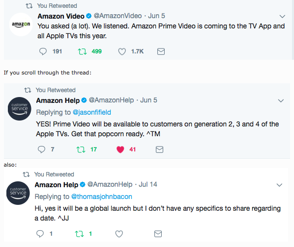 Besides, Apple announced it however we are waiting for Amazon to release it. This could be due to legitimate delays maybe because of 4k HDR or something or it could be Amazon intentionally dragging their feet. Apple and Amazon have never been on the best of terms and for some reason those 2 make it "feel" personal.