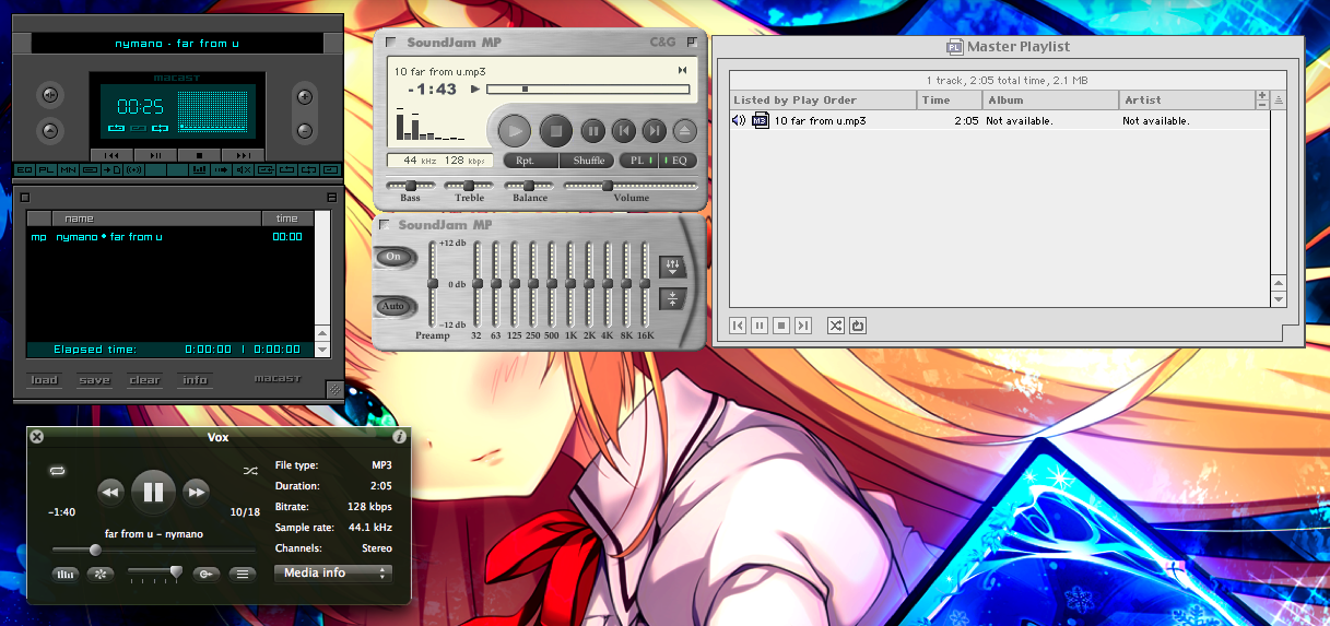 MACAST (top left) is a Classic Mac OS music player made by some of the same people that made Winamp. It's.... fine enough, as long as you're also fine with no higher than 128kbps MP3s because it will