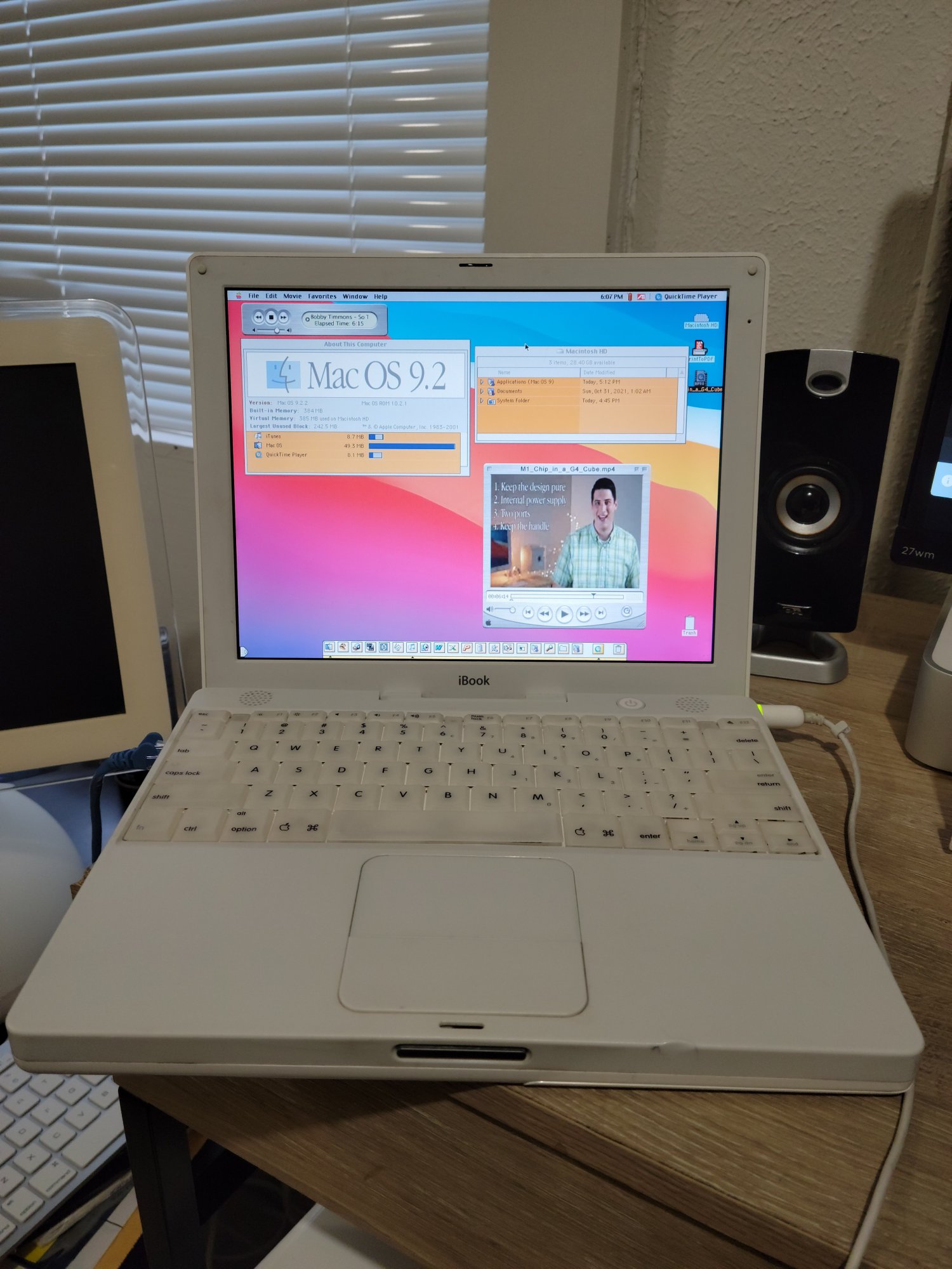 Cleaned up and brought my iBook G3 800mhz back with a new working keyboard; one that doesn't smell like dirty socks, albeit slightly yellowed. I should have snapped a photo of the mold-encrusted original keyboard before trashing it. Oops. Someday, I'll take it apart and clean the seams of the dirt and (likely) mold. Listening to some jazz radio in iTunes at the moment (downloaded the .pls)...
