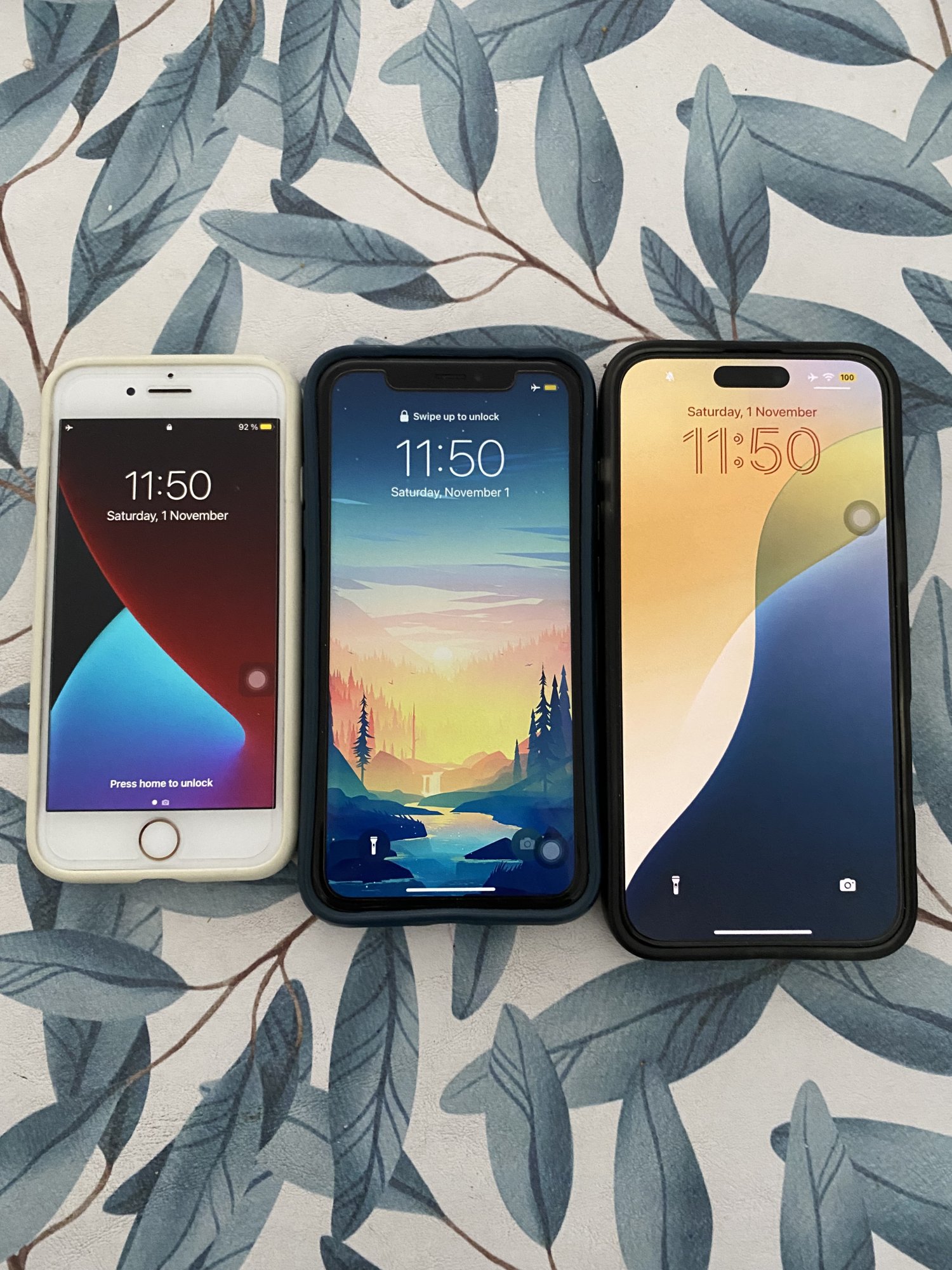 From left to right: iPhone 8, iOS 14; iPhone Xʀ, iOS 12; iPhone 16 Plus, iOS 18: