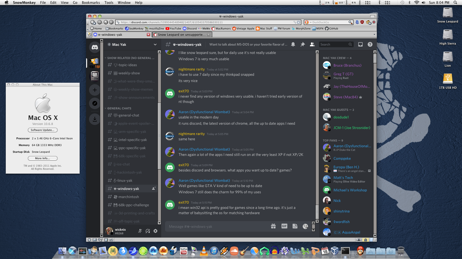 For gits and shiggles i wanted to see if SnowMonkey/SpiderWeb/InterWeb would work with Discord on 10.6. It does, mostly. The discord UI is a little laggy, but it works (without audio/video support). I suggest using @B S Magnet 's emoji workaround and going in to about:config and creating an override for discord.com.
