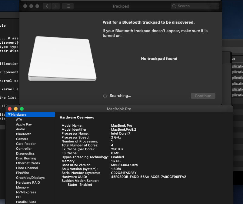 2) The screen cap foreshadowed the other unexpected issue: the patched Mojave won’t recognize the MBP’s trackpad.