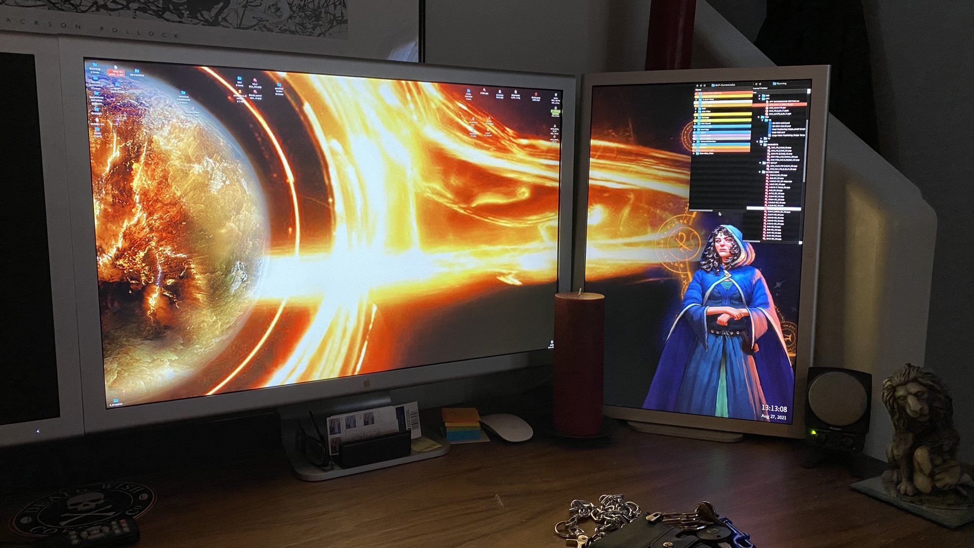 I amused myself for all of two or three minutes by taking the wallpaper I use for one of my 30" Cinema Displays and 24" Cinema Displays and copied them over to the work MBP.