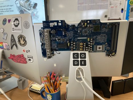 I redid the decorations on the back of one of the monitors in my classroom. On the one, I've had the logic board of a TI-99/4A and a G5 module; those haven't changed. On the other though, I had the logic board of a very dead 14" iBook G4 and an older ThinkPad. I've replaced those two today with the logic board of a very, very dead 17" iMac G5! I love the look of the blue logic boards.