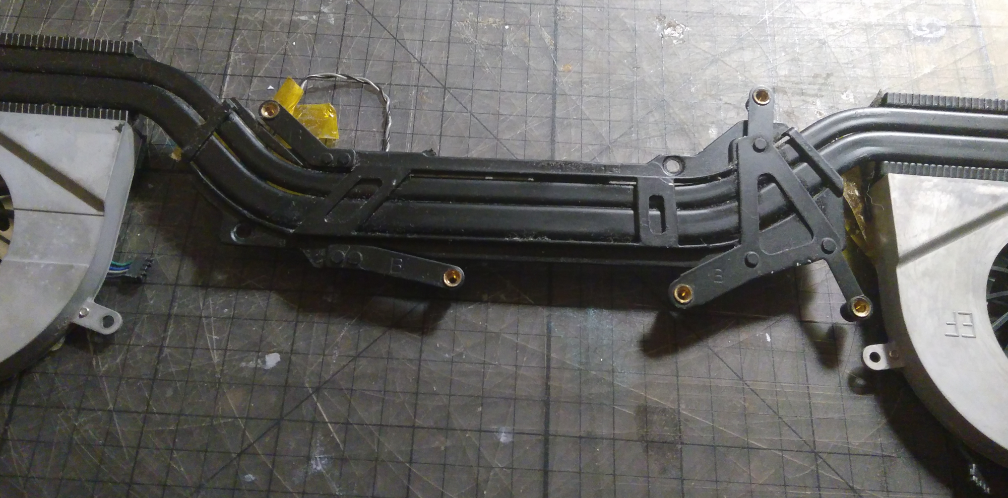 In the above pics, those little cross-members which are about a millimetre higher than the pair of pipes beneath are the only portions of the heat sink which make physical contact with the bottom of the case. This is, I hypothesized, why cooling is so poor: they designed it so that the fans — and those minor cross-member contact points — are the only active and passive means, respectively, of moving heat away from the processors. Also, these contact points might lend to why the hot spots get so hot: all the heat which can be shunted passively through those tiny cross-members are creating especially hot areas on the bottom case where they make direct contact.