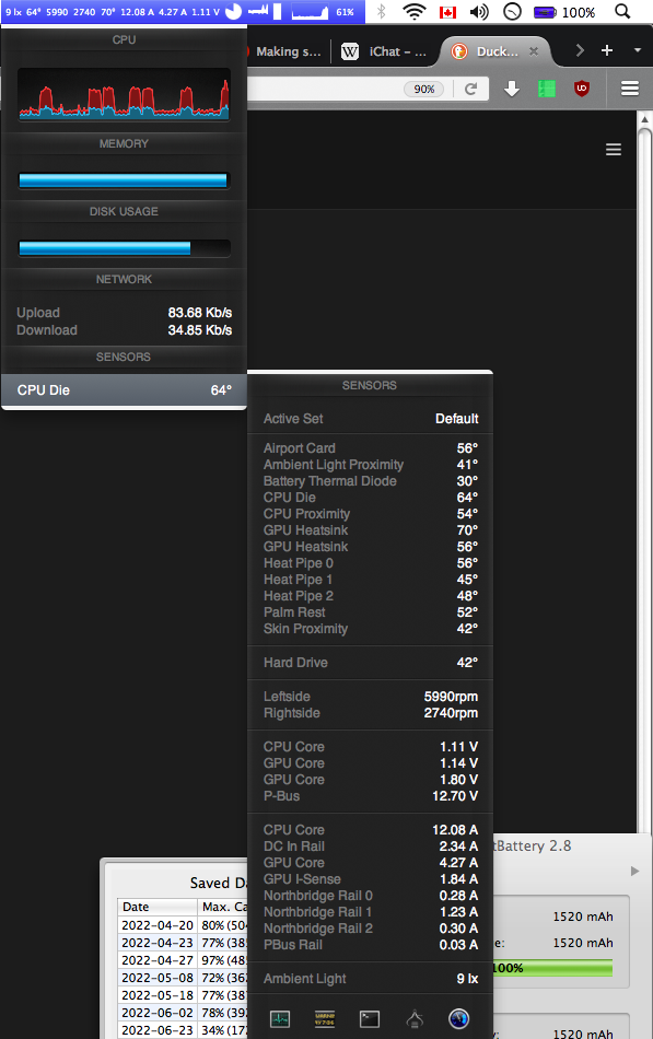 This MBP was the one I only started using last year after sourcing a green-dot board for it. As with all my Macs, I use Noctua NT-H2 paste, which is consistently pretty good at doing what it’s supposed to do. Even so, the MBP was still warm to hot in very localized spots directly beneath the heat sink bridge, particularly on the left side (or, the side nearest the Magsafe adapter). I’m guessing a far-infrared camera would have shown three localized hot spots where the CPU, GPU, and memory controller are located.