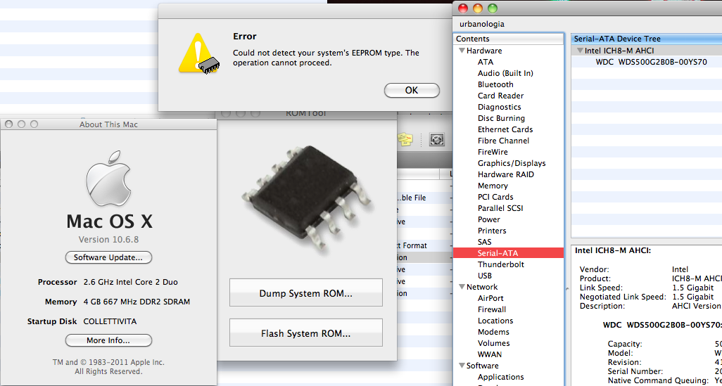 The only reason why I think my particular MBP could be having trouble is I have a green-dot board which I bought direct from Thailand. That board has not yet been assigned with a serial, and it’s also possible the EEPROM contents may not have the details it would need for ROMtool to parse and dump the EEPROM’s contents: