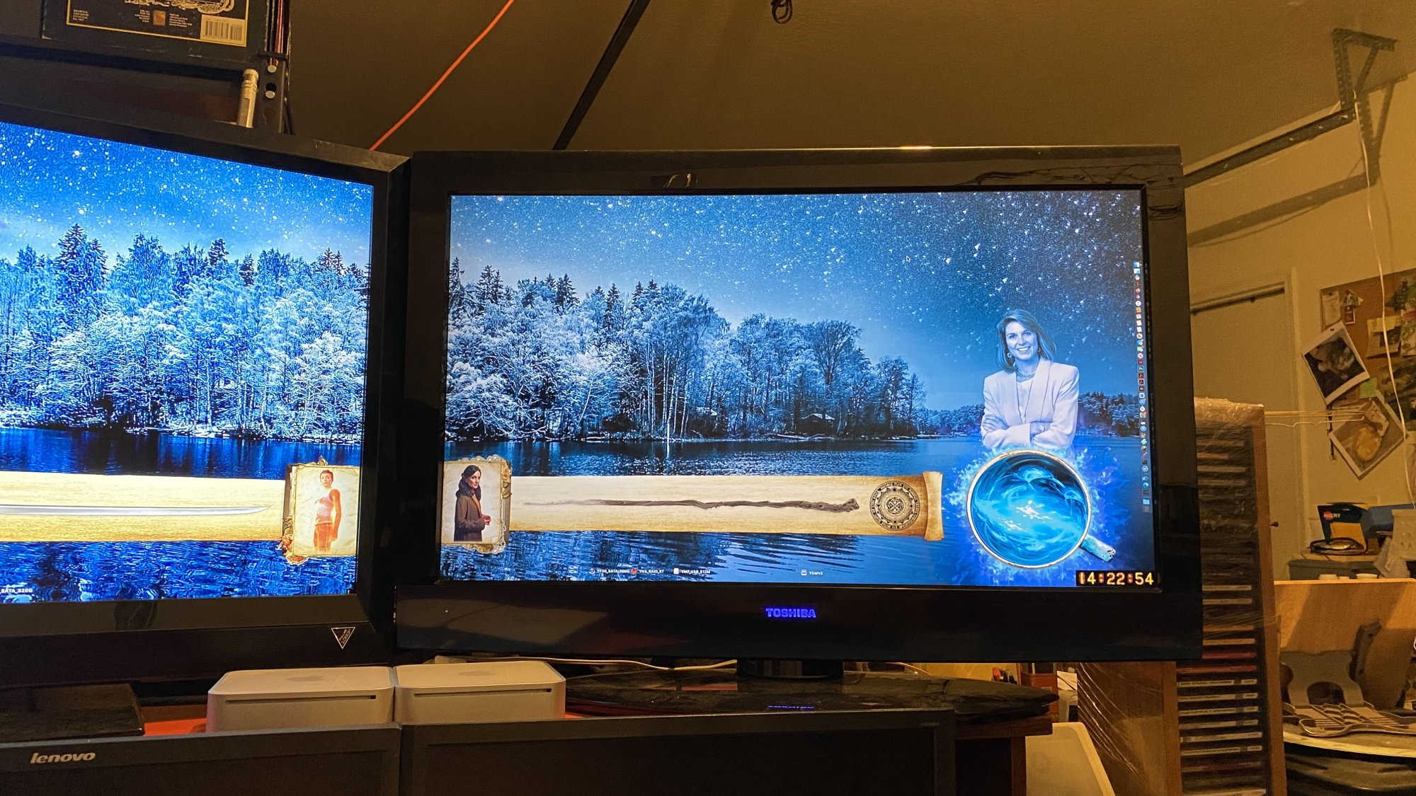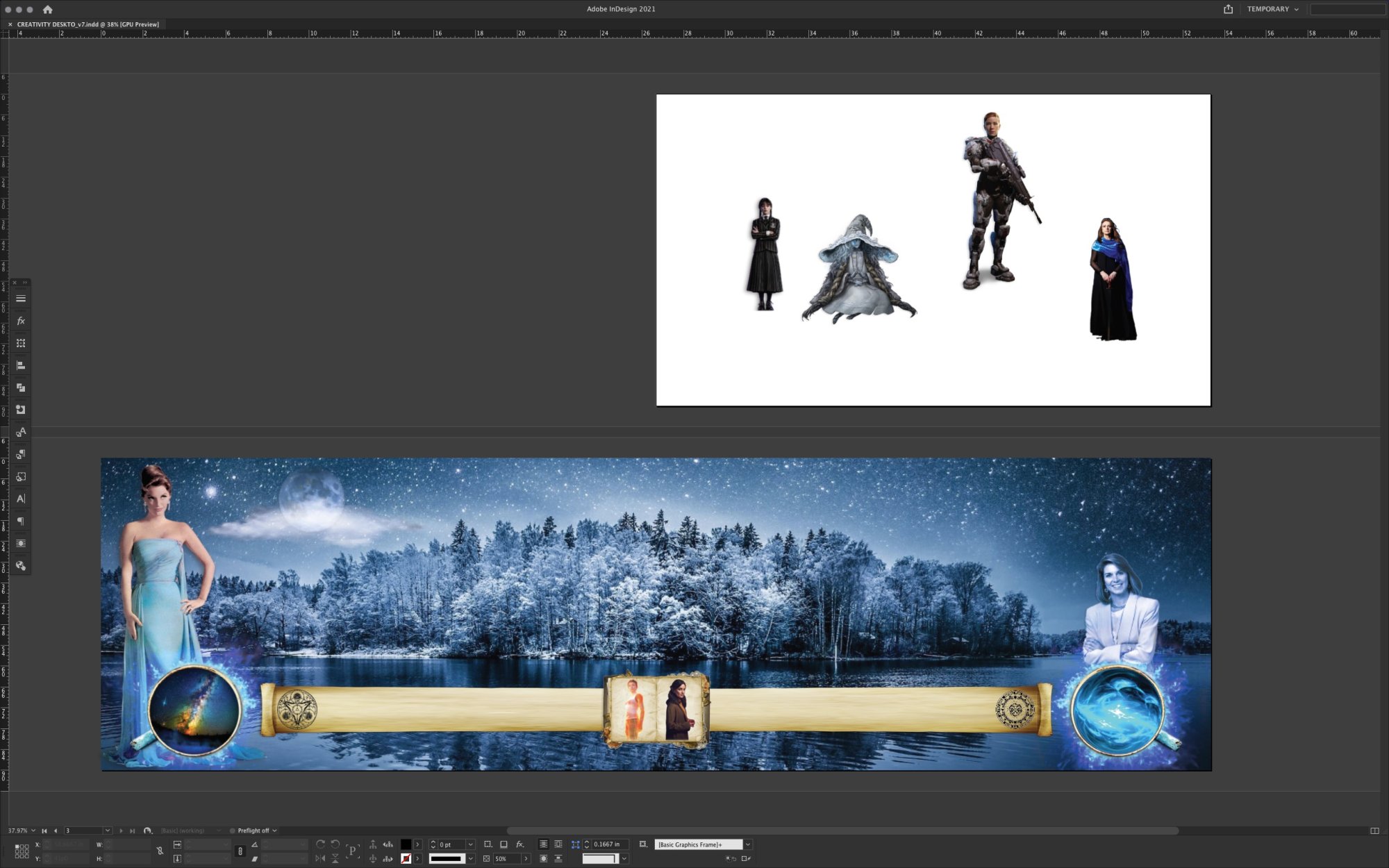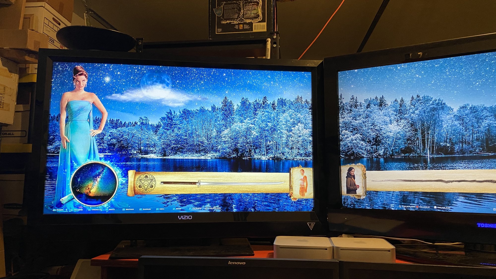 I'm not showing the guides so it looks like one contiguous picture. That's the point, because I don't want to try and match stuff up. So build it as 3840x1080 pixels and have InDesign slice it in half, page 2 for my left display and page 3 for my right display.