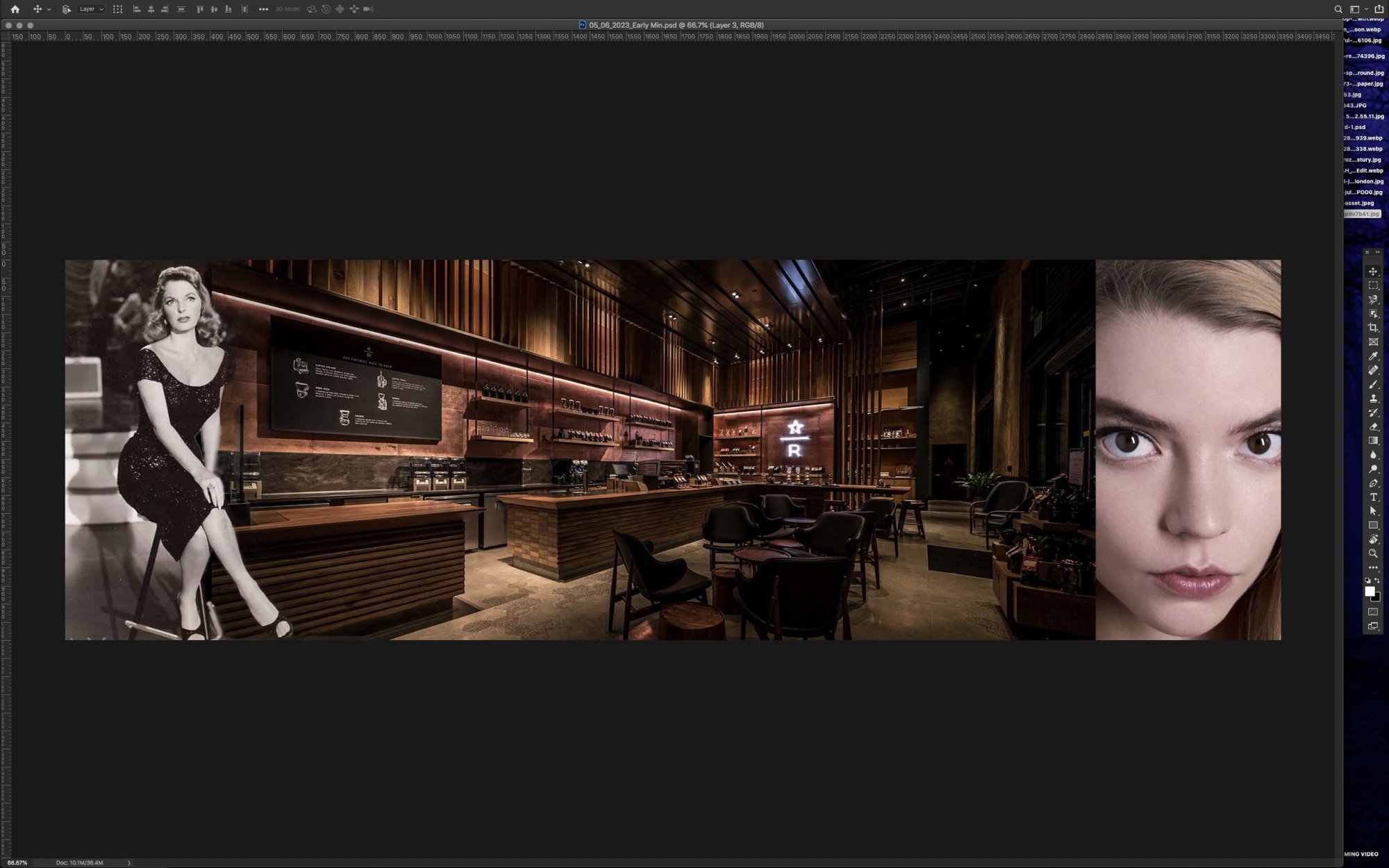 The characters in the top right panel - are they to be included in the main letterbox screen panel.? You're working with quite contrasting factors in your image sources, like light sources, cast shadows ..or lack there of, and clothing tones...which makes it tricky to get to look right.
